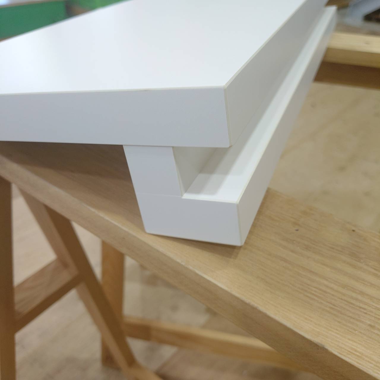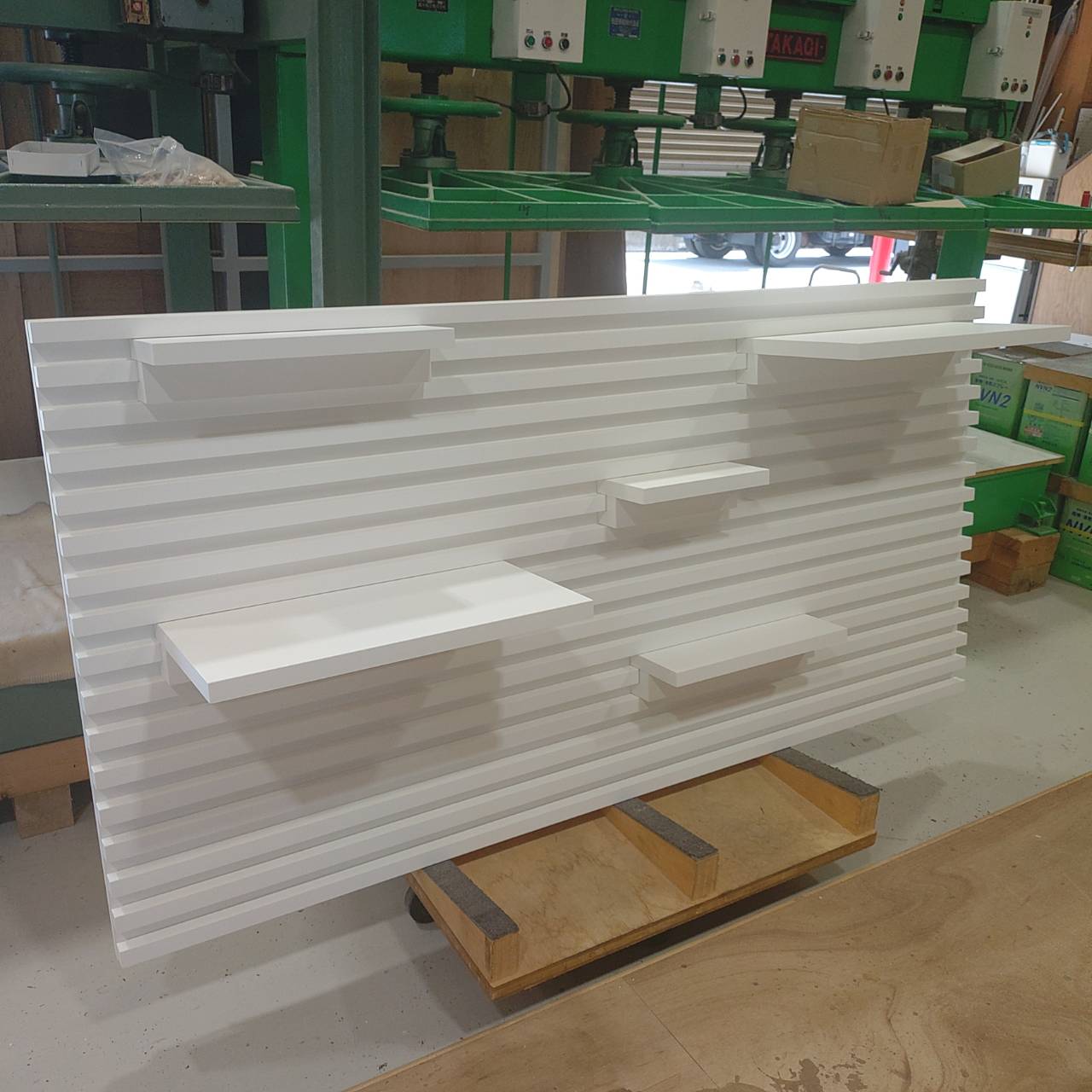 店舗の壁掛けの棚です。 棚板を差し込むために、凸凹なミゾ風の仕様です。 壁サイズ:W2000×H1000 仕様:オールメラミン仕様