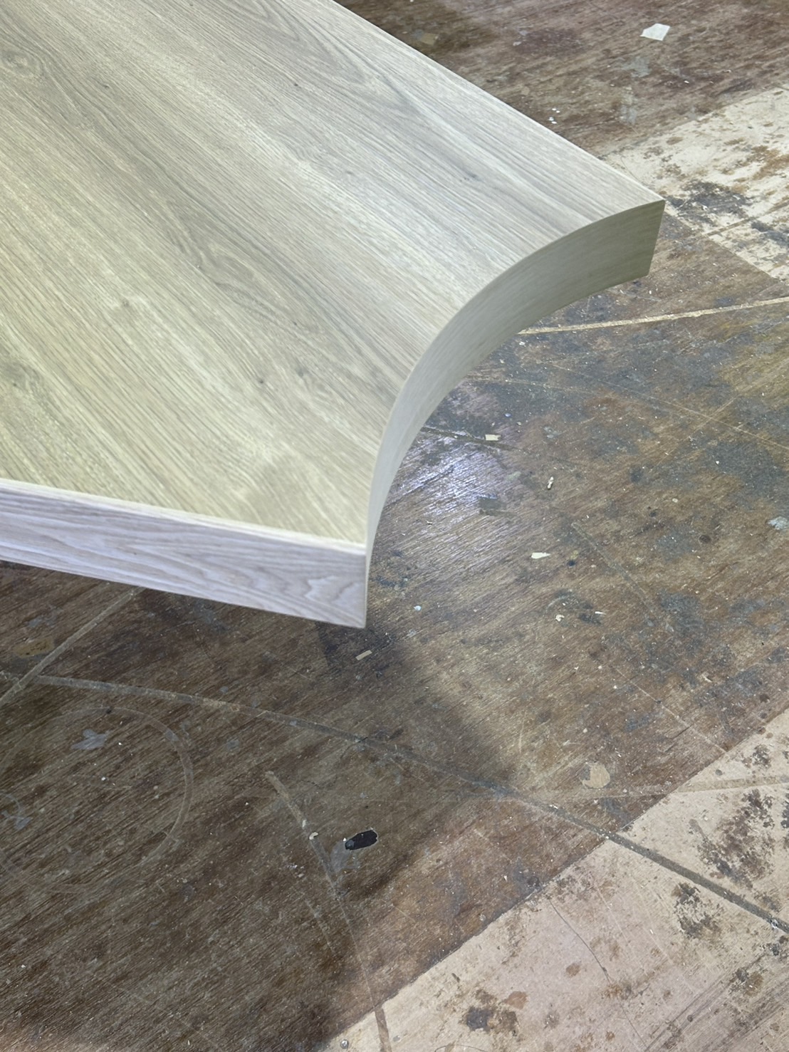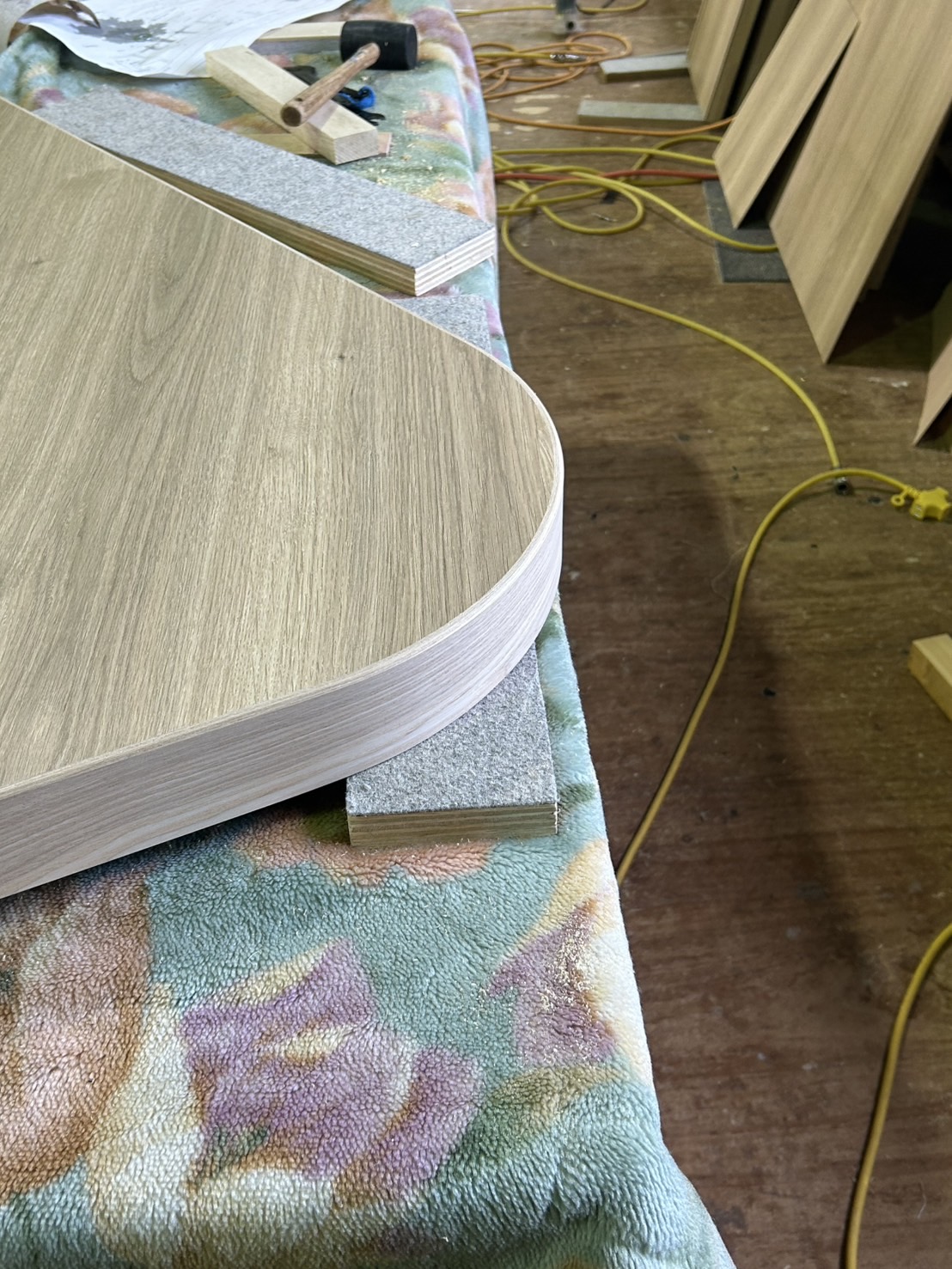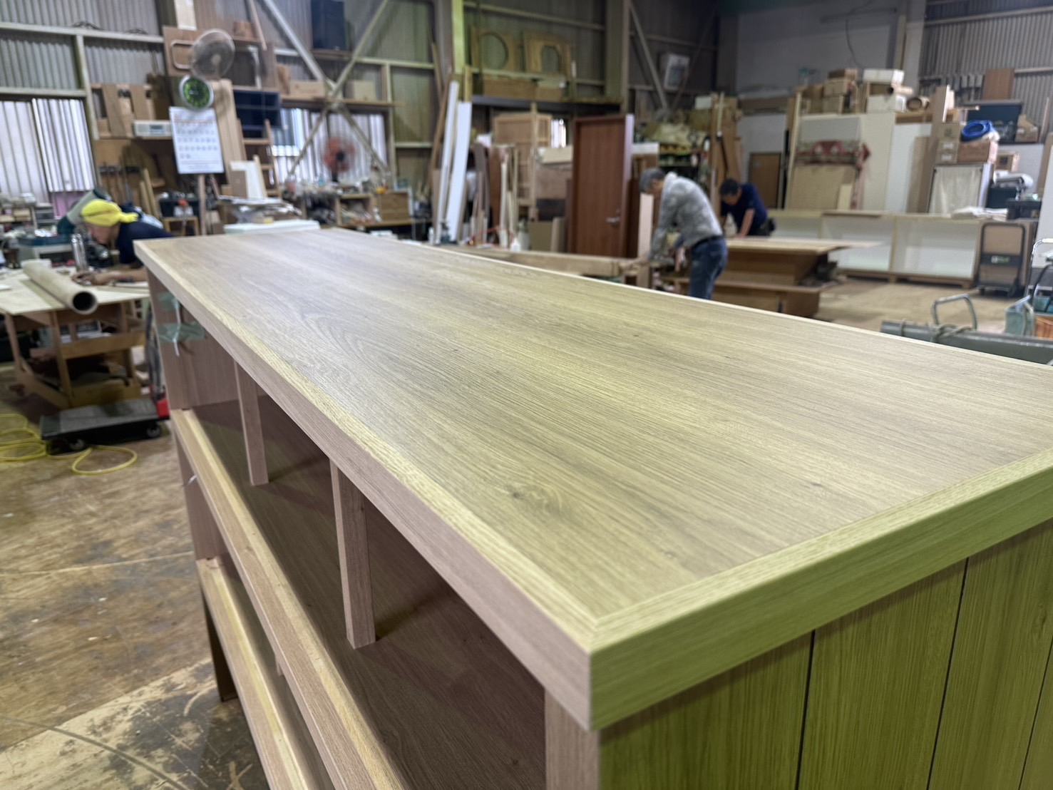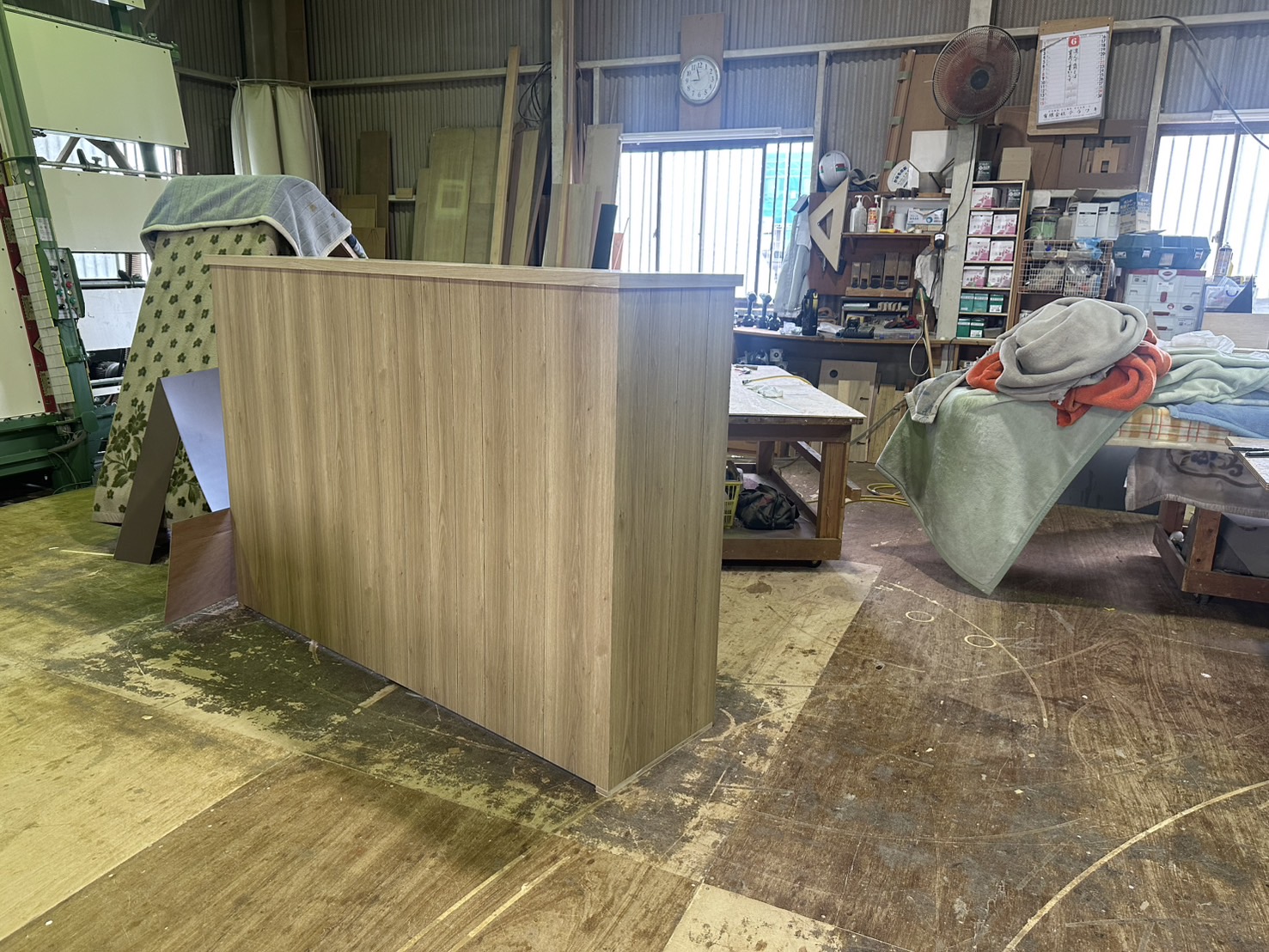 仕上:木目メラミン仕様、小口は無垢材、突板塗装